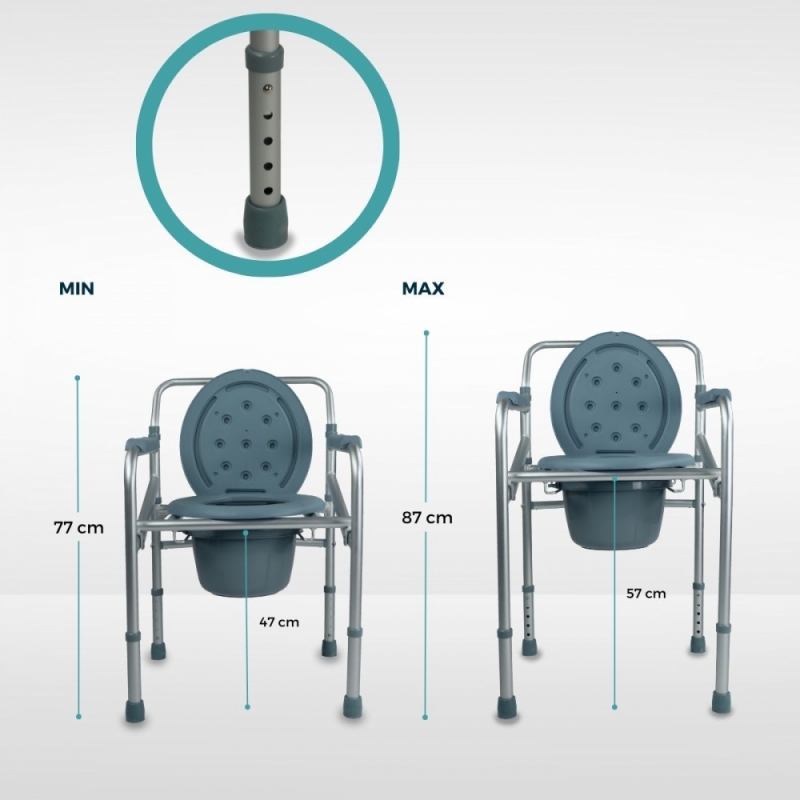 AJUSTABLE: la silla wc plegable cuenta con la posibilidad de ser regulada en altura entre 77-87 cm.