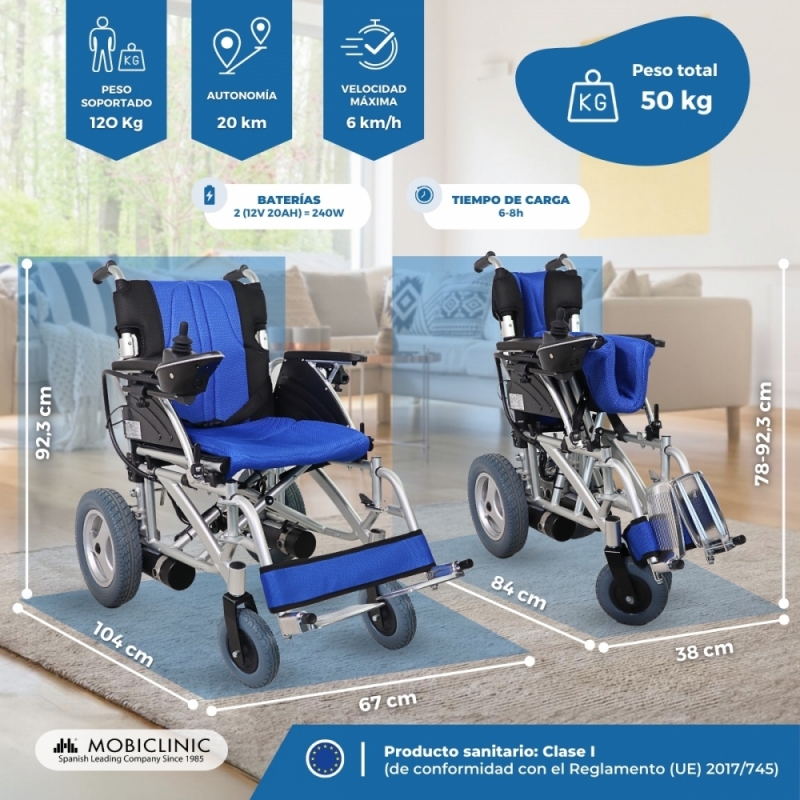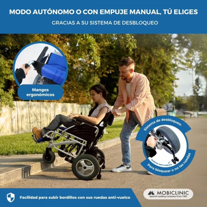 SILLA ULTRALIGERA: el material de esta silla de ruedas de aluminio la hace ser muy ligera permitiendo una movilidad más sencilla. Con un peso total de 50 kg (incluidas las baterías) es capaz de soportar hasta 120 kg de peso.