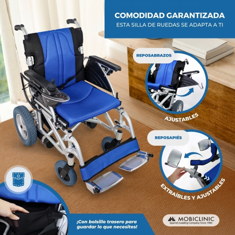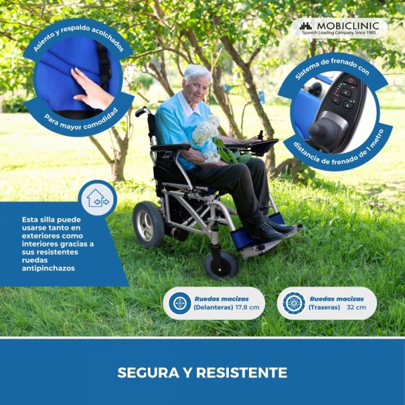 Gracias a su diseño acabado en aluminio y plegable (para plegarla, hay que retirar las baterías), hacen que esta silla de ruedas para personas mayores sea muy ligera y fácil de transportar y guardar.