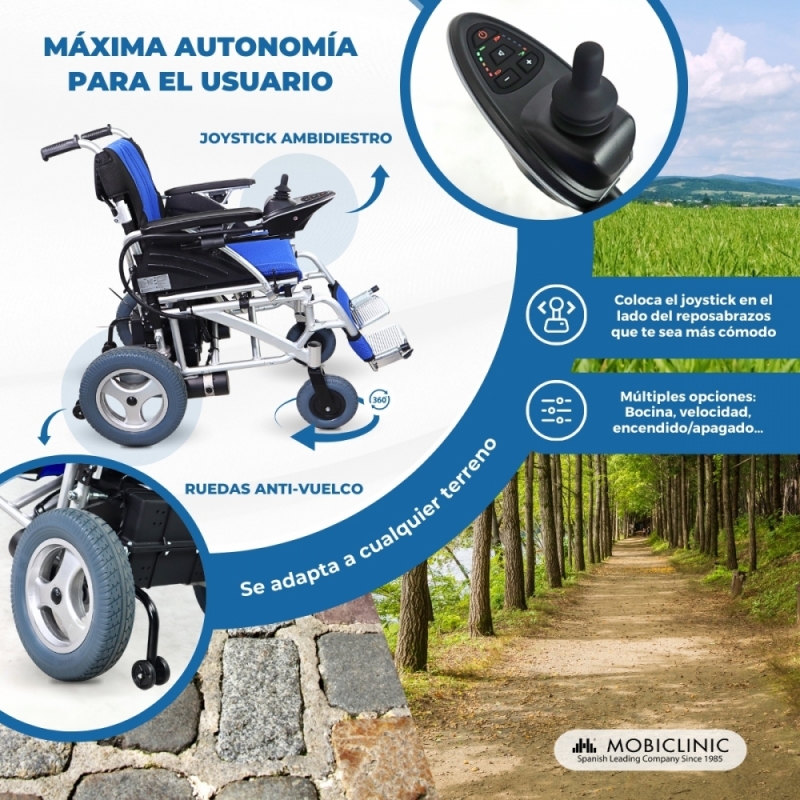 ADAPTABLE: la silla de ruedas eléctrica se adapta a cualquier usuario, gracias a su joystick adaptable para diestros o zurdos, reposapiés extraíbles y plegables o sus reposabrazos abatibles.