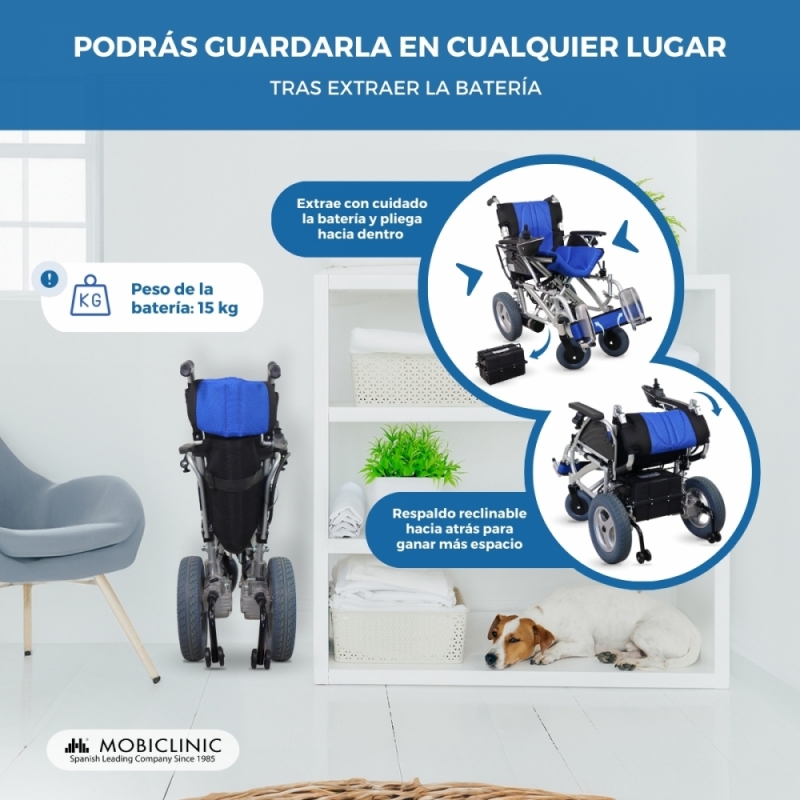 PLEGABLE: esta silla de ruedas eléctrica es plegable (retirando sus baterías), de esta forma, puede ser transportada y guardada con total facilidad.