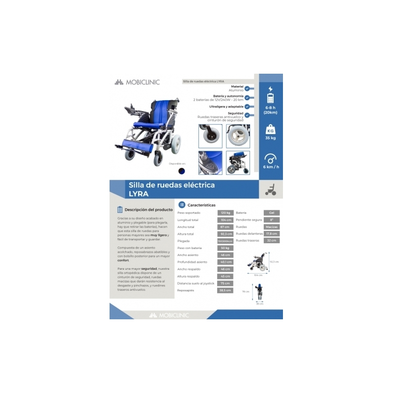 BATERÍA Y AUTONOMÍA: la silla de ruedas Lyra cuenta con dos baterías de gel de 12V 20AH (240W) , que le permite una autonomía de 20 km.