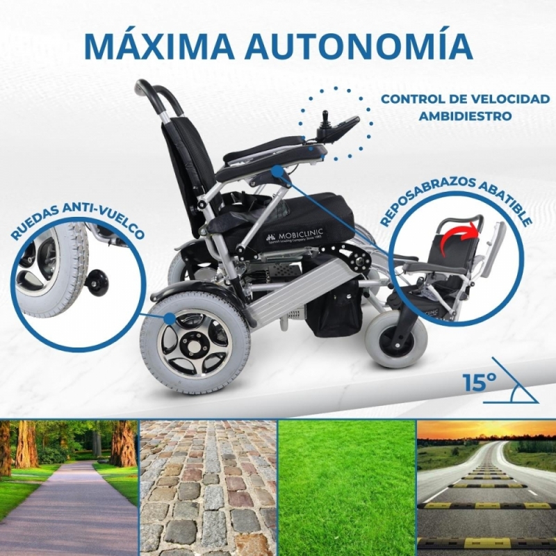 La silla de ruedas eléctrica Troya Plus Ultra de Mobiclinic ha sido diseñada para garantizar la comodidad y movilidad del usuario en todo tipo de terrenos. Gracias a su peso (sin baterías) de solo 24.8 kg y a su práctico sistema de plegado hacia delante, podrá transportar esta silla en cualquier maletero y usarla allí donde le sea necesaria. Además, cuando no esté haciendo uso de ella, podrá guardar esta silla plegable en cualquier rincón de su hogar sin ningún problema.