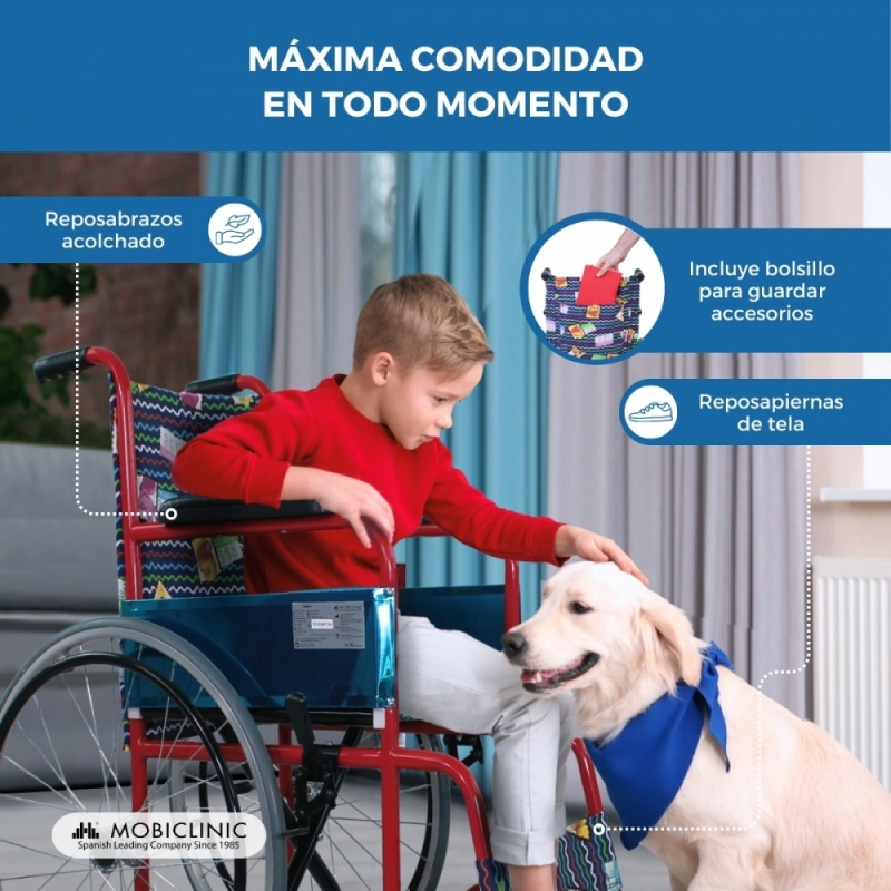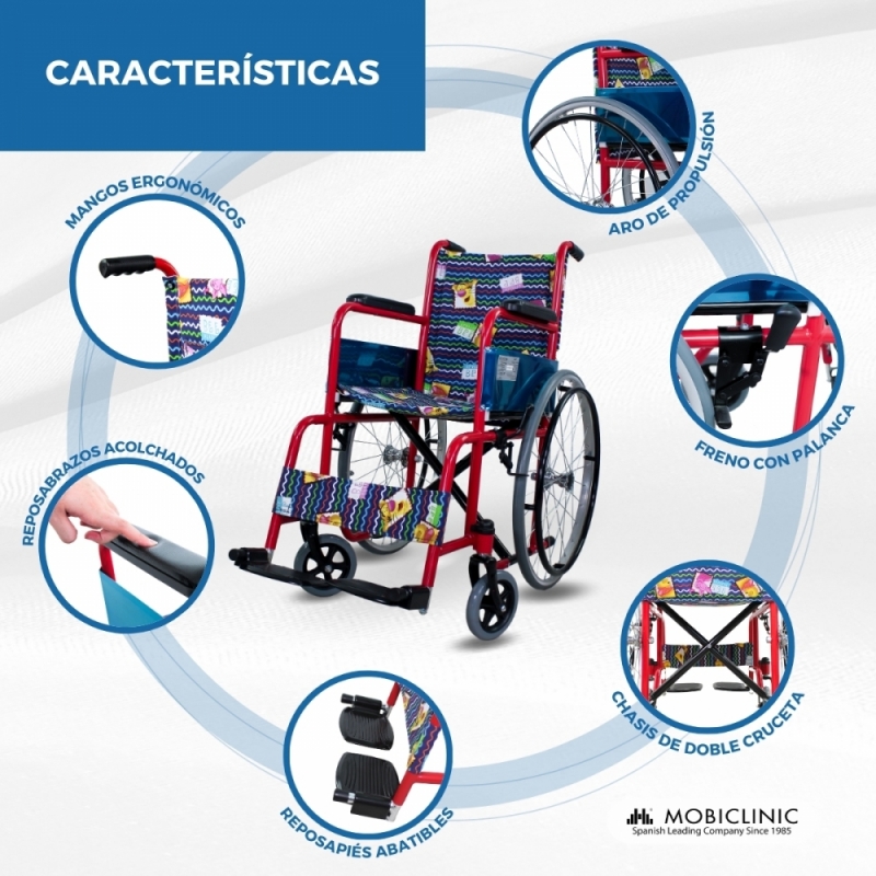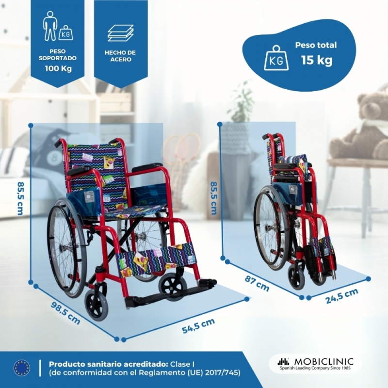 DISEÑO JUVENIL: silla de ruedas para niños o adolescentes con movilidad reducida, postoperatorios, hospitales, centros comerciales y empresas.