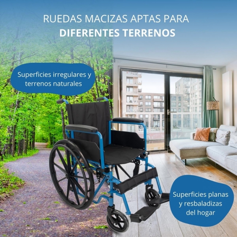 La silla de ruedas ortopédica modelo 'Marsella' es un estilo de silla que resalta por su gran comodidad y acabado. Su línea de diseño y su asiento ergonómico permiten ver que es una silla de ruedas moderna, práctica y cómoda. Las ruedas son macizas y no necesitan inflado, por lo que son más resistentes que las ruedas neumáticas tradicionales.