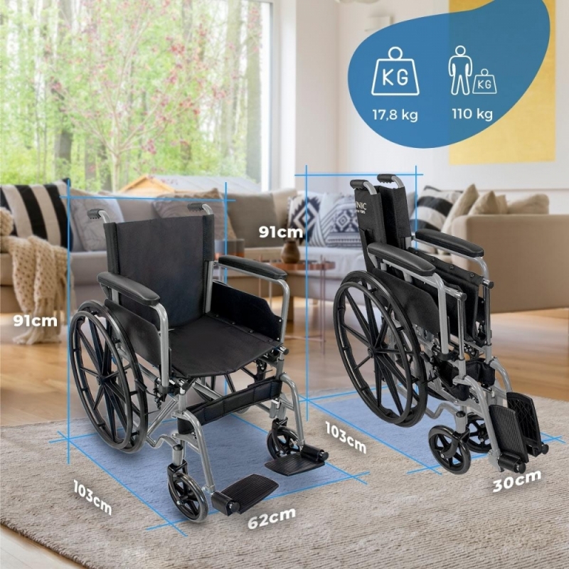 PUERTAS Y MALETERO: Esta silla de ruedas tiene un ancho total de 62 cm, por lo que puede pasar por puertas de ancho estándar de 72.5 cm. Además como esta silla plegada mide sólo 20 cm, se puede transportar en el maletero de un vehículo tipo Ford Focus. Asegúrese de las medidas de sus puertas y vehículo para comprobar que le viene bien.