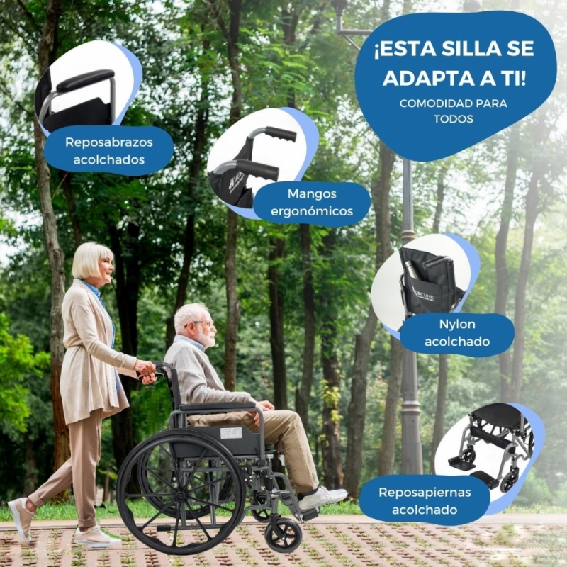 CÓMODA: Dispone de ruedas grandes autopropulsables, reposapiés abatibles y desmontables y reposabrazos acolchados completamente abatibles, firmes y cómodos. Además tiene frenos en las ruedas traseras haciéndola una silla para ancianos segura.