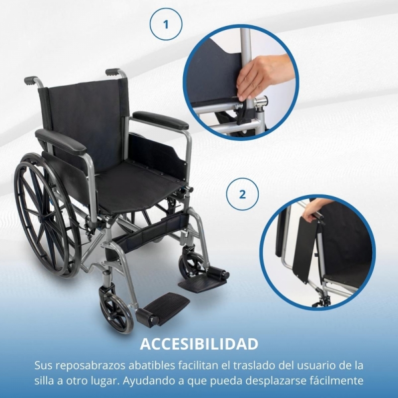 Su facilidad para el plegado gracias a sus reposapiés abatibles y desmontables y sus reposabrazos abatibles completamente hacen que sea perfecta para llevar en cualquier transporte y a cualquier lugar. Dispone de un bolsillo trasero que nos dará un extra de espacio de almacenaje.