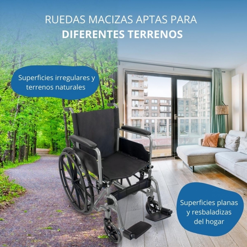 La silla de ruedas ortopédica modelo 'Marsella' es un estilo de silla que resalta por su gran comodidad y acabado. Su línea de diseño y su asiento ergonómico permiten ver que es una silla de ruedas moderna, práctica y cómoda. Las ruedas son macizas y no necesitan inflado, por lo que son más resistentes que las ruedas neumáticas tradicionales.