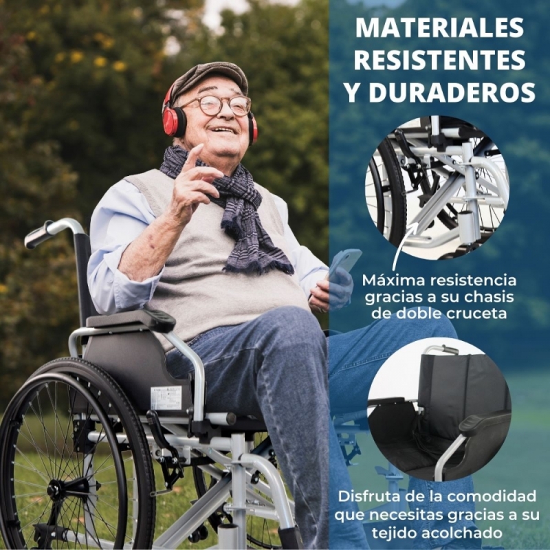 RESISTENCIA Y DURABILIDAD: Formada por un chasis de doble cruceta y una estructura robusta de acero que hacen que la silla de ruedas sea resistente y duradera para un uso prolongado. Formada por ruedas macizas que soportarán cualquier superficie sin pinchazos.