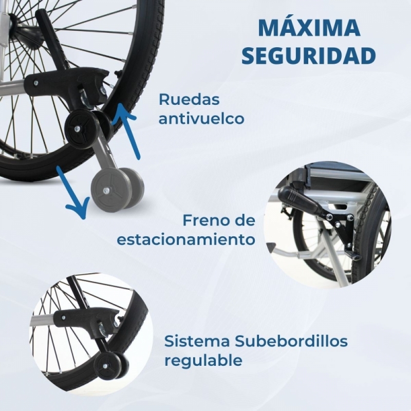 SEGURIDAD Y ESTABILIDAD: Su estructura de acero la hace estable y duradera y las ruedas antivuelco permiten transportar al usuario por cualquier superficie de forma segura. Además, los frenos de estacionamiento brindan mayor seguridad gracias a que podrás dejar la silla completamente fija.