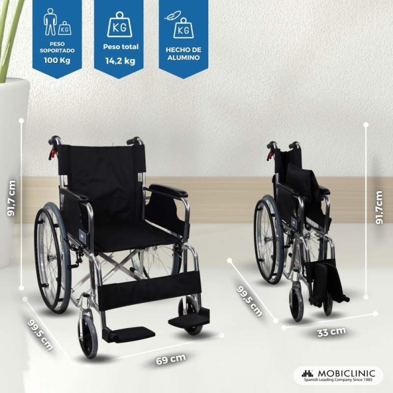 Nuestras sillas ortopédicas están fabricadas en aluminio, lo que le aporta una gran ligereza. Cuenta con un respaldo abatible de color negro, reposabrazos fijos rectos largos y reposapiés abatibles, que le harán más confortable la vida al usuario.