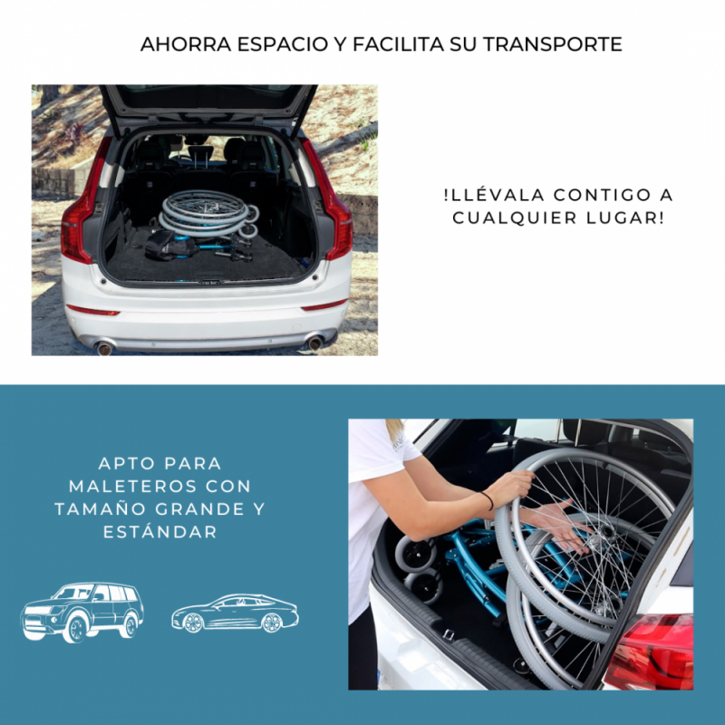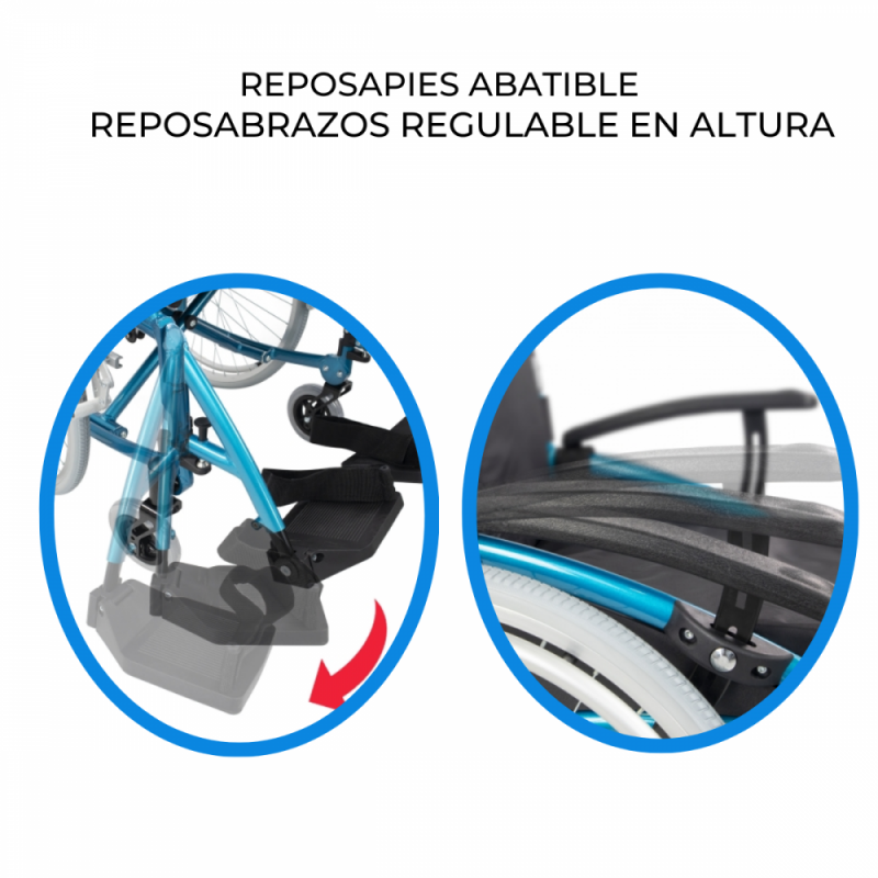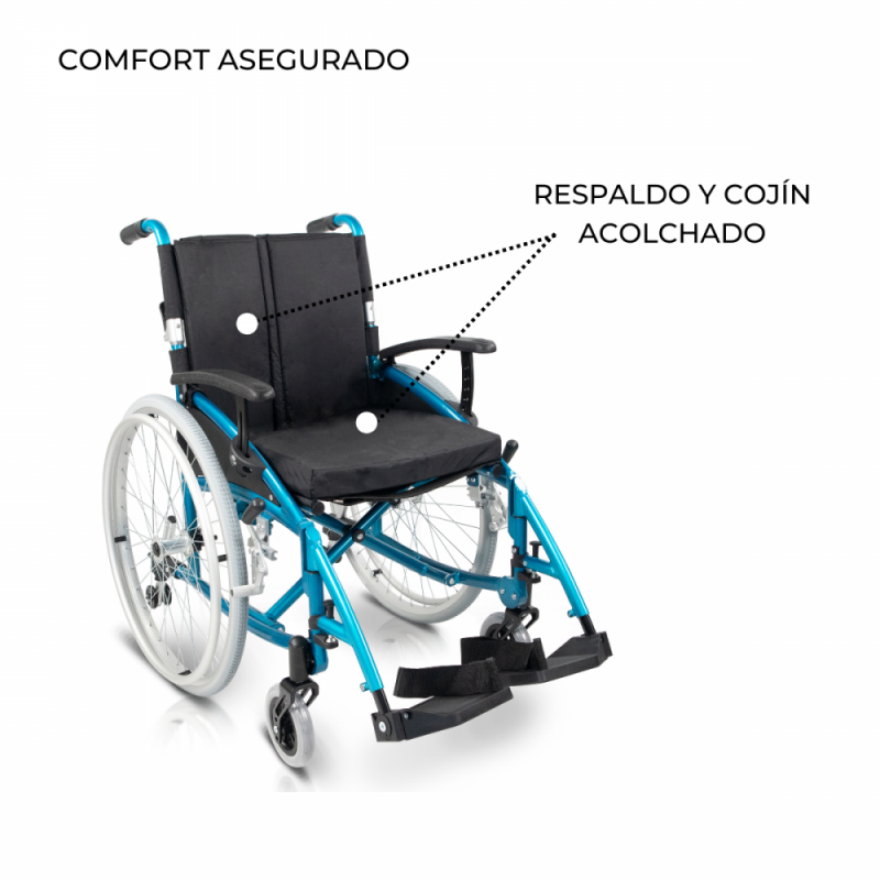 SEGURA: Silla de ruedas fabricada en aluminio, lo que aporta mayores garantías y más durabilidad. Cuenta con un sistema de ruedas traseras antivuelco para evitar que el usuario pueda caerse hacia atrás. Incluye un cinturón ajustable con desenganche rápido para aportar un extra de seguridad.