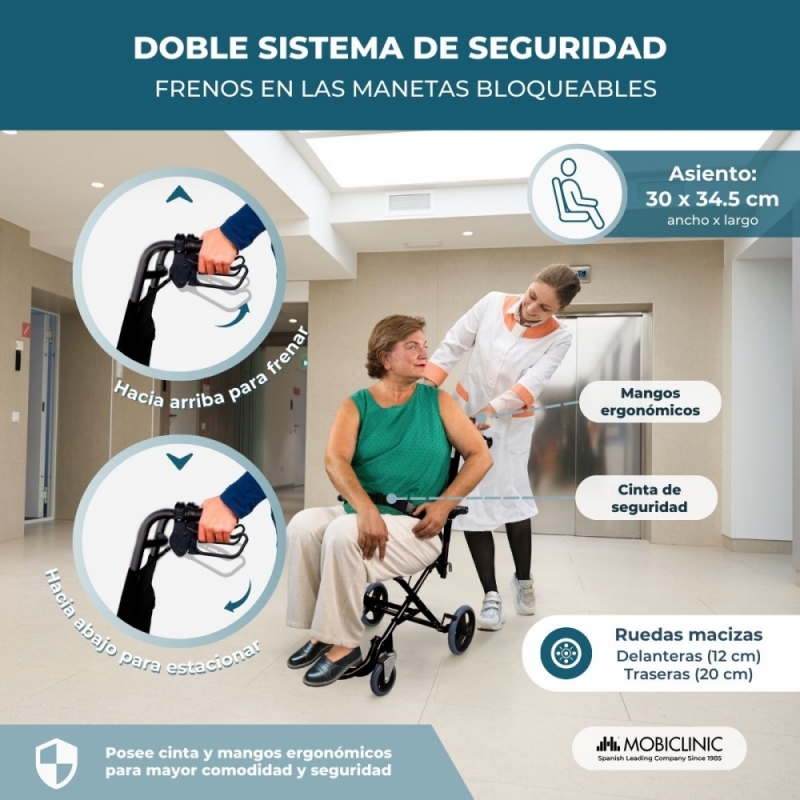 SEGURA: dispone de una doble barra de seguridad fabricada con material ignífugo para aportar mayor resistencia a esta silla de ruedas para ancianos.