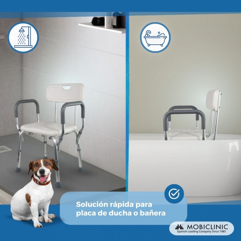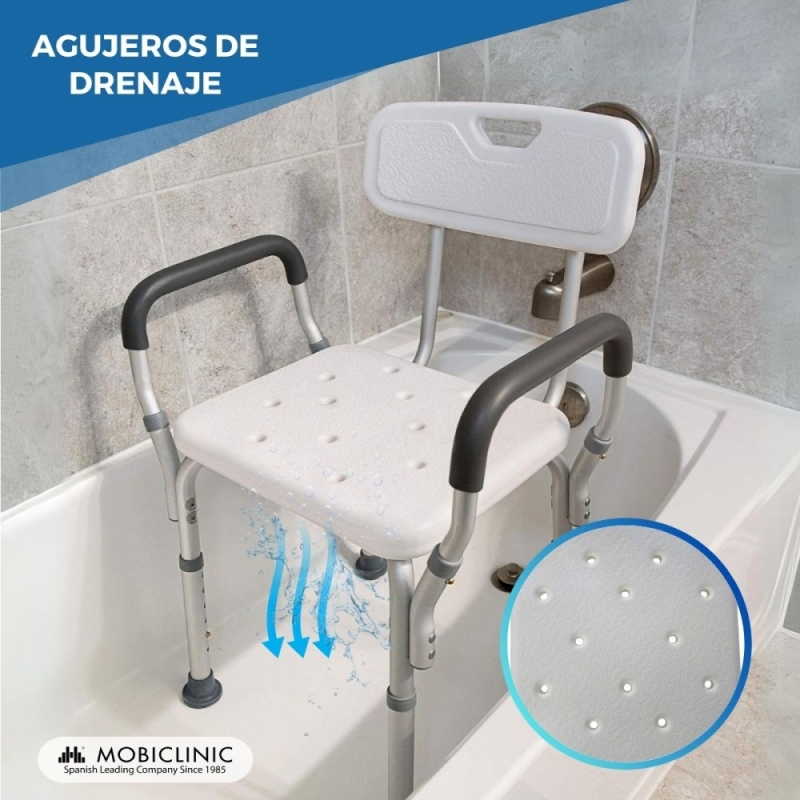 Esta silla ortopédica para ducha es muy ligera, ya que está fabricada en aluminio y PVC. Gracias a esta característica, podrá colocar o mover de sitio la silla para baño sin ningún esfuerzo mediante las asas del respaldo. Los reposabrazos están forrados de espuma para mejorar el agarre y aumentar el confort del usuario. Además, el montaje de este taburete es muy sencillo.