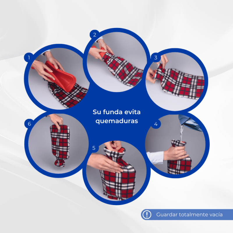 A la hora de elegir una bolsa de agua es importante la seguridad de la persona, por ello, esta bolsa de agua cuenta con un forro para evitar posibles quemaduras por el contacto directo con la parte más caliente de la bolsa.