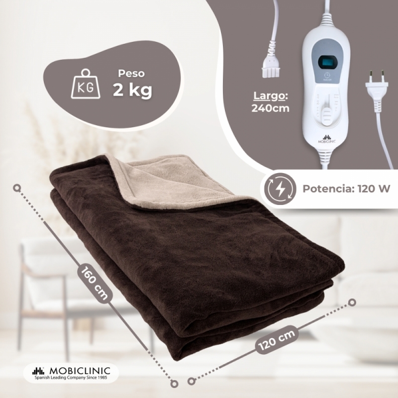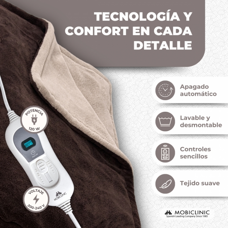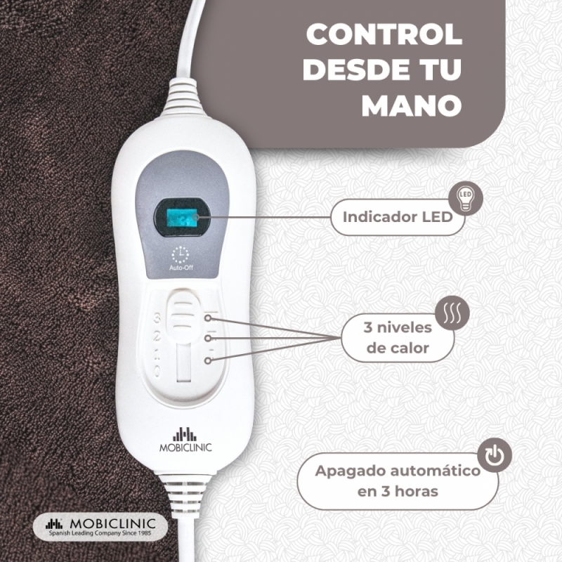 Manta eléctrica que proporciona un sueño tranquilo y seguro a una temperatura agradable y protege del frío y la humedad. Posee un mando de control digital y regulación de 3 ajustes de calor con indicador de nivel LED. Tiene una función de desconexión automática después de aproximadamente 3 horas de funcionamiento.