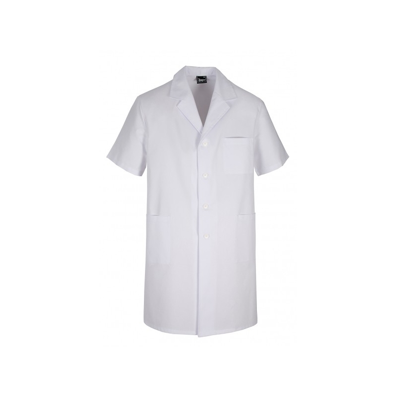 Bata sanitaria clásica de color blanco. Abierta delante con botones. Manga corta.
