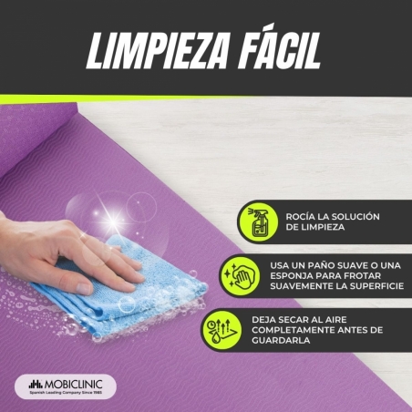 Una vez finalizado el ejercicio, esta esterilla es muy fácil de limpiar, ya que simplemente tendrás que limpiarla con un paño con agua y jabón, luego enjugarla y finalmente secarla con un paño seco. De esta forma, puedes mantener tu alfombrilla como el primer día.