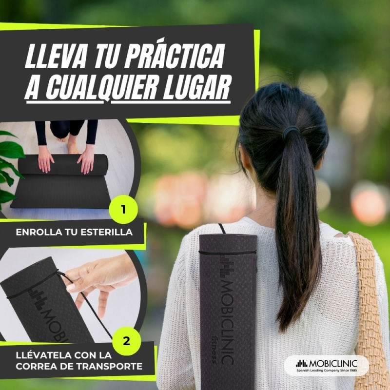 Además, esta colchoneta de yoga y pilates incluye una cinta de transporte que permite trasladarla de una forma fácil y cómoda. Por lo tanto, se puede llevar fácilmente al gimnasio, parques o o cualquier lugar donde desees realizar el ejercicio.